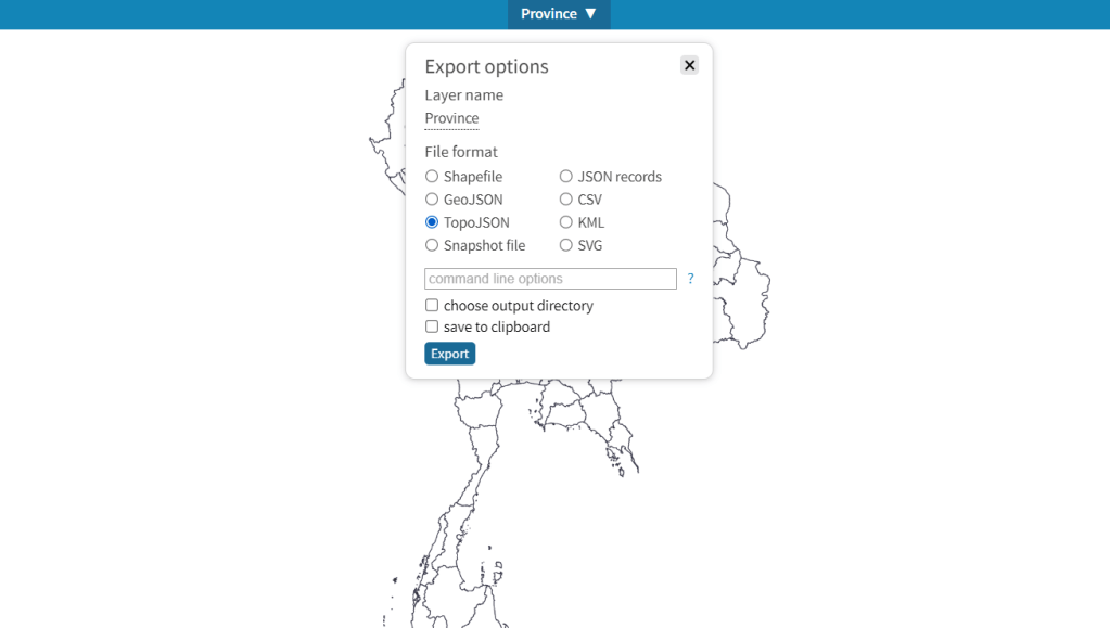 เลือก File format >> Topo JSON >> Export >> เลือกที่เก็บในเครื่องเรา