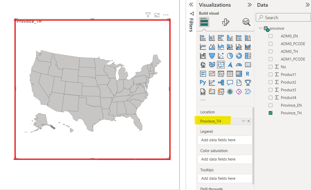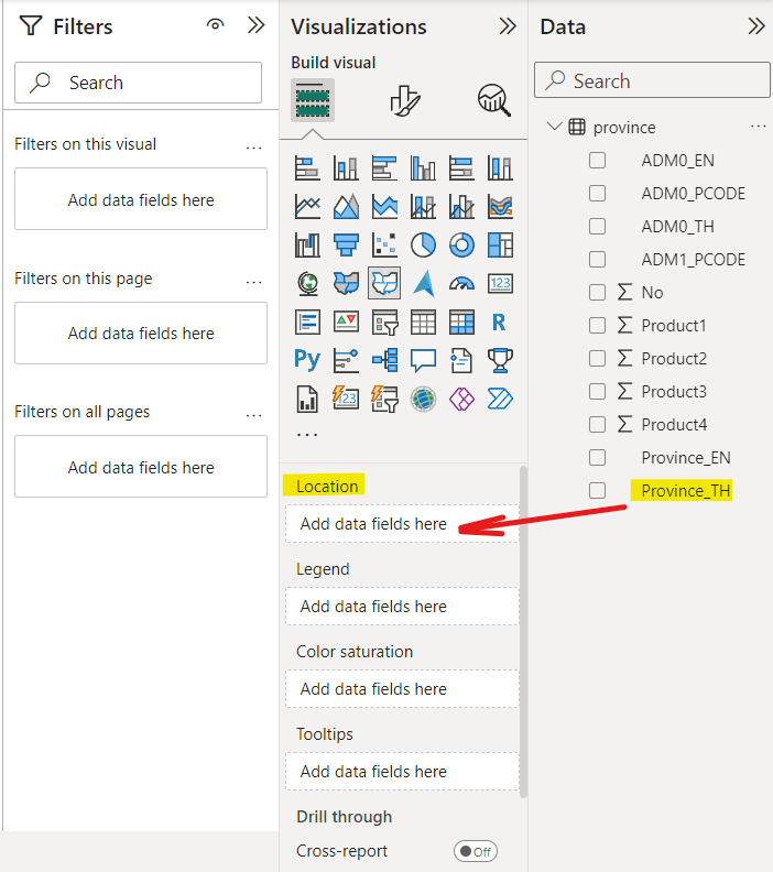 จากนั้นไปที่ Tab Data >> Province >> Province_TH มาใส่ใน Tab >> Tab Visualizations >> Location (คลิกค้างแล้วลากวาง) เหมือนในภาพด้านล่าง