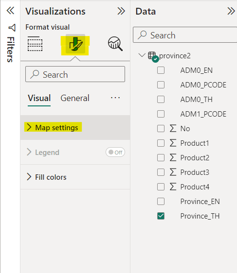 ต่อมาไปที่ Tab Visualizations >> Format your visual สัญลักษณ์ที่มีพู่กันและมีกราฟแท่งสีเขียว เหมือนภาพด้านล่าง แล้วเลือก Map settings