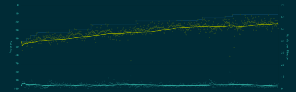 ที่บอกว่าเว็บนี้เขาเก็บสถิติให้เราอ่านง่ายครับ สวยงามอีกด้วย ดูภาพด้านล่างนะครับ สีเหลืองคือ word per minute(WPM) สีฟ้า คือ Accuracy(acc) เป็นสถิติตั้งแต่วันแรกเลยนะครับ