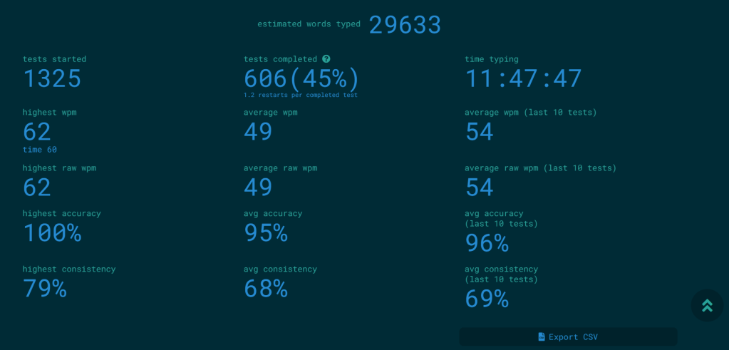 มาดูอีกด้านที่เป็นตัวเลขกันบ้าง บอกทั้งหมดเลยพิมพ์ไปทั้งหมดกี่คำ กี่ครั้ง สูงสุด เฉลี่ย ทั้งด้านจำนวนคำ ความถูกต้อง แถมจะ Export ไปเป็น CSV ก็ได้